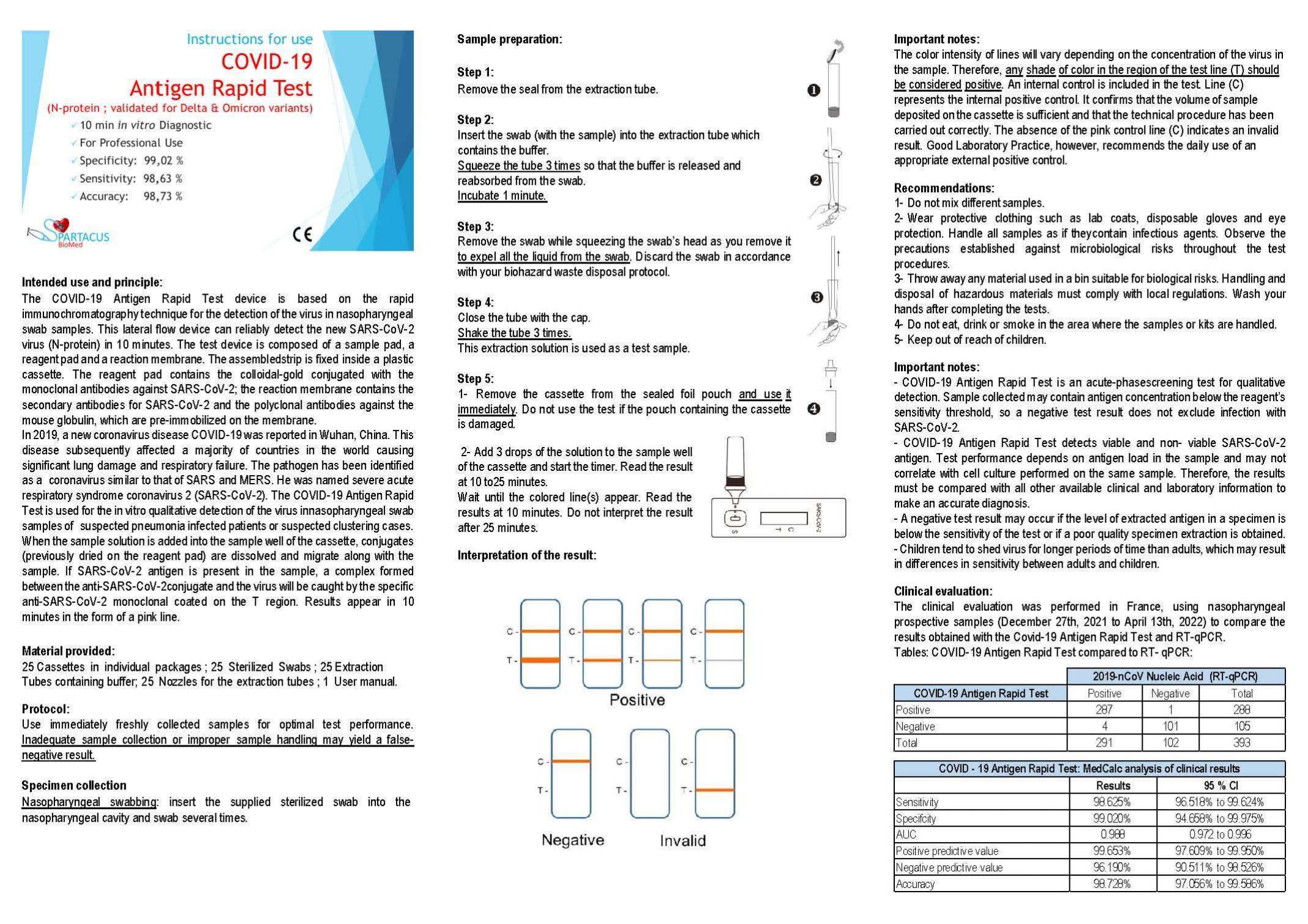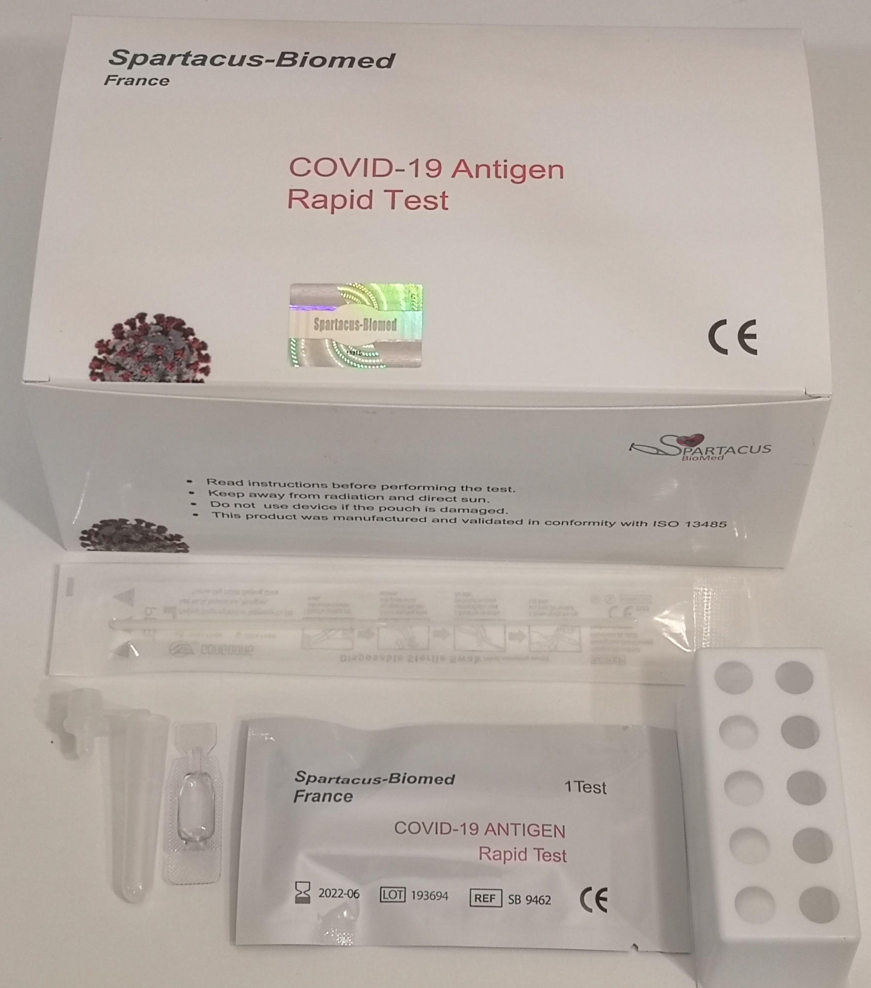 Spartacus-Biomed presents the COVID-19 ANTIGEN RAPID TEST for a rapid detection of the virus as a diagnostic aid for the COVID-19. This device is based on the rapid immunochromatography technique for the detection of the virus in nasal swab and nasal aspirate samples. This lateral flow device can reliably detect the new SARS-CoV-2 virus in 10 minutes. The test device is composed of a sample pad, a reagent pad and a reaction membrane. The assembled strip is fixed inside a plastic cassette. The reagent pad contains the colloidal-gold conjugated with the monoclonal antibodies against SARS-CoV-2; the reaction membrane contains the secondary antibodies for SARS-CoV-2 and the polyclonal antibodies against the mouse globulin, which are pre-immobilized on the membrane. In 2019, a new coronavirus disease COVID-19 was reported in Wuhan, China. This disease subsequently affected a majority of countries in the world causing significant lung damage and respiratory failure. The pathogen has been identified as a coronavirus similar to that of SARS and MERS. He was named severe acute respiratory syndrome coronavirus 2 (SARS-CoV-2). The COVID-19 Antigen Rapid Test is used for the in vitro qualitative detection of the virus in the throat swabs, sputum samples of suspected pneumonia infected patients or suspected clustering cases. When the sample is added into the sample well, conjugates (previously dried on the reagent pad) are dissolved and migrate along with the sample. If SARS-CoV-2 is present in the sample, a complex formed between the anti- SARS-CoV-2 conjugate and the virus will be caught by the specific anti- SARS-CoV-2 monoclonal coated on the T region. Results appear in 10 minutes in the form of a pink line.